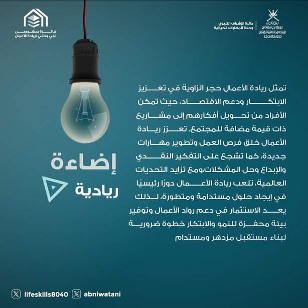 مشروع يثري منهج المهارات الحياتية لطلاب الصف العاشر بجانب تطبيقي لريادة الأعمال، انسجامًا مع توجيهات الحكومه في التأكيد على دور المشاريع الصغيرة والمتوسطة في التنمية الاقتصادية. كما يركز على الابتكار، الذكاء الاصطناعي، والتقنيات المتقدمة، مع تمكين الشباب وتدريبهم للاستفادة من الفرص، بما يجعل هذا القطاع ركيزة أساسية للاقتصاد الوطني.