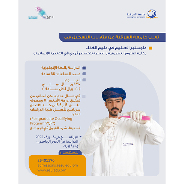 | علوم الغذاء والتغذية | 6 | الإنجليزية | 9000.00 | إنهاء دبلوم التعليم العام