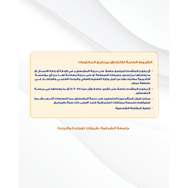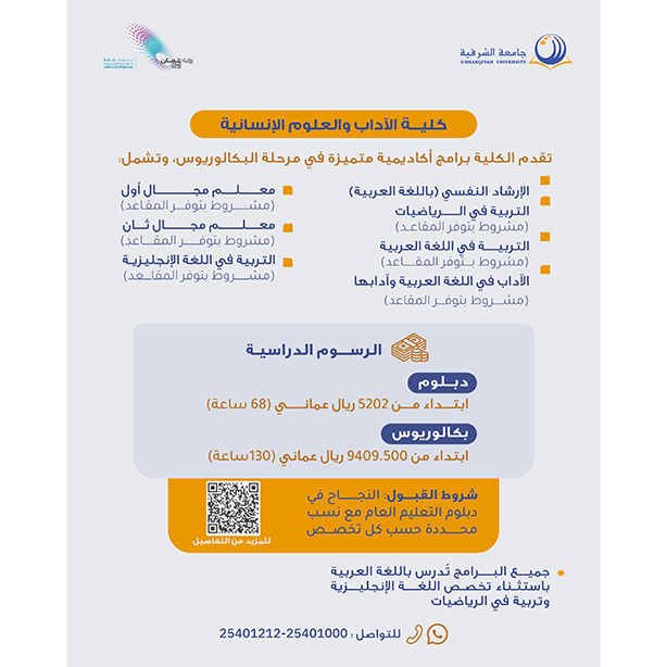 | نطم المعلومات الادارية | 5 | الإنجليزية | 8000.00 | النجاح في دبلوم التعليم العام بنسبة 65% |