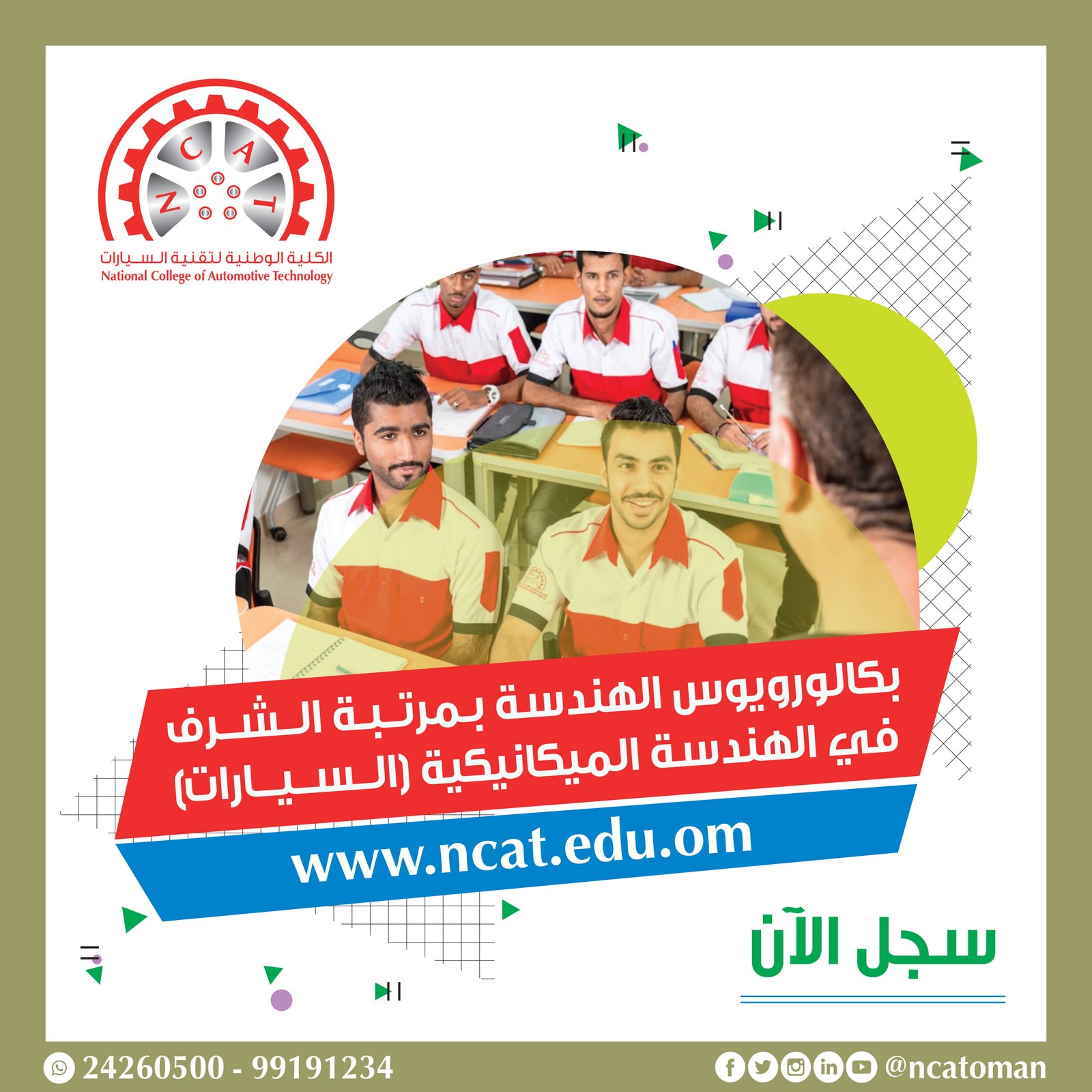 أول كلية متخصصة في قطاع السيارات في سلطنة عمان، نهدف إلى رفد قطاع السيارات في السلطنة بكوادر وطنية. الكلية الوطنية لتقنية السيارات ش.م.م (NCAT) هي كلية خاصة تهدف إلى تزويد قطاع السيارات والنقل والخدمات اللوجستية في سلطنة عمان بالفنيين ذوي المهارات العالية على المستوى الوطني.